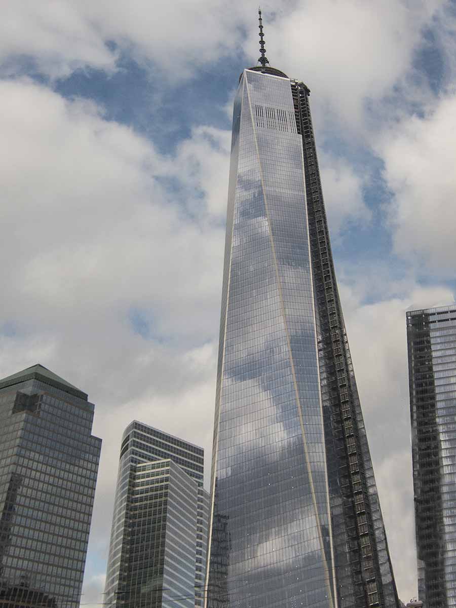 Forty years later I watched this new tower being erected story by story from my view in Long Beach. It’s rooftop cranes, like an insects’ antennae poised and sensitive for approaching danger. But that day last week I stood close up in the street before it, One WT, towering into the blue sky, a raised symbol of resilient America, a beacon too, as majestic as the Lady of the harbor.