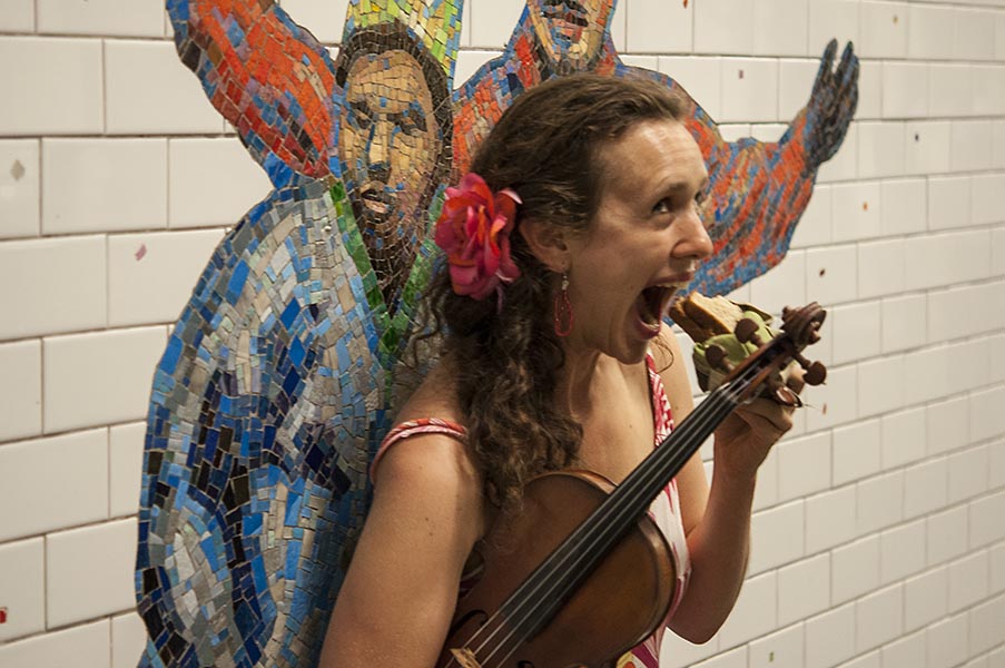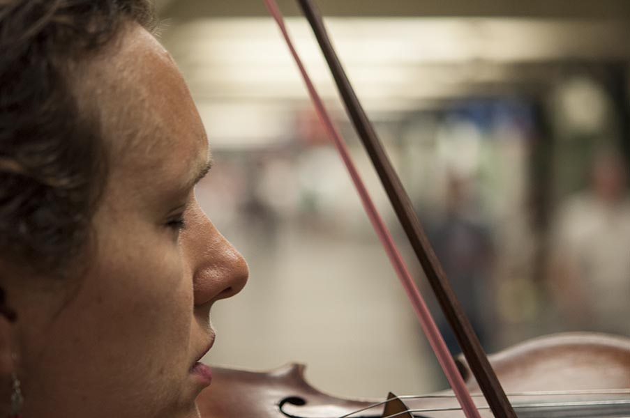 A violinist caught on her lunch break on camera finds the humor in it: