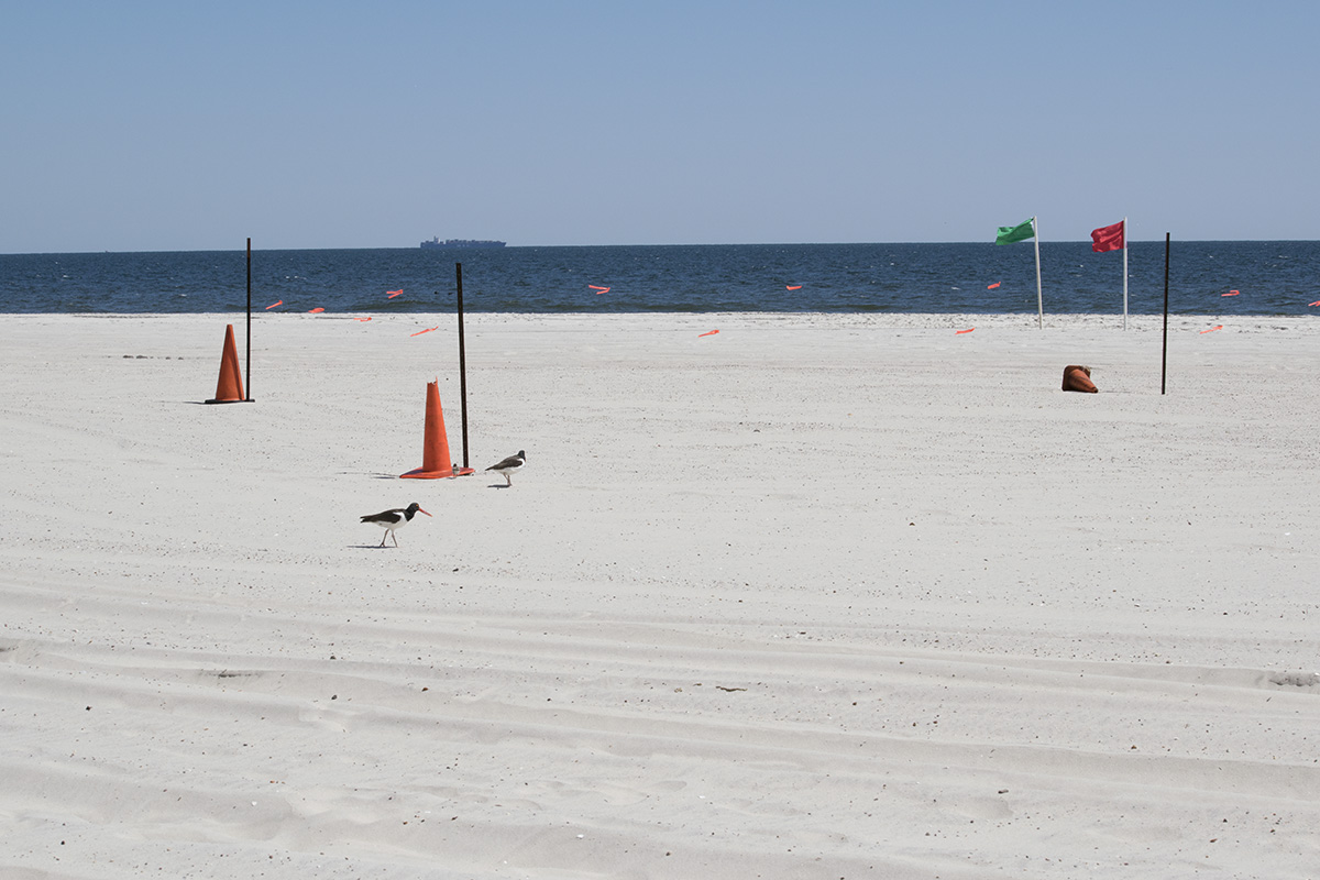 Maybe the’ll move back to the nesting-site perimeter when they feel it’s safe again. The presence of the cones, whether the shore birds are within the perimeter or not, serves as a warning to other shore denizens, us, to be wary. Maybe signs should mounted atop special cones, “Vulnerable Wildlife Area.” Can’t hurt, might help.