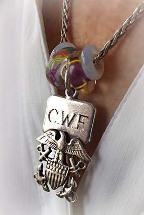There’s the Merchant Marine cuff link of Cheryl’s dad. She turned it into a necklace medallion. Because her dad’s fingers worked the stud into his starched Captain’s cuffs, she feels a power that resides there. Yes, there is soul satisfaction in that silver that carries right into the heart over which it rides.