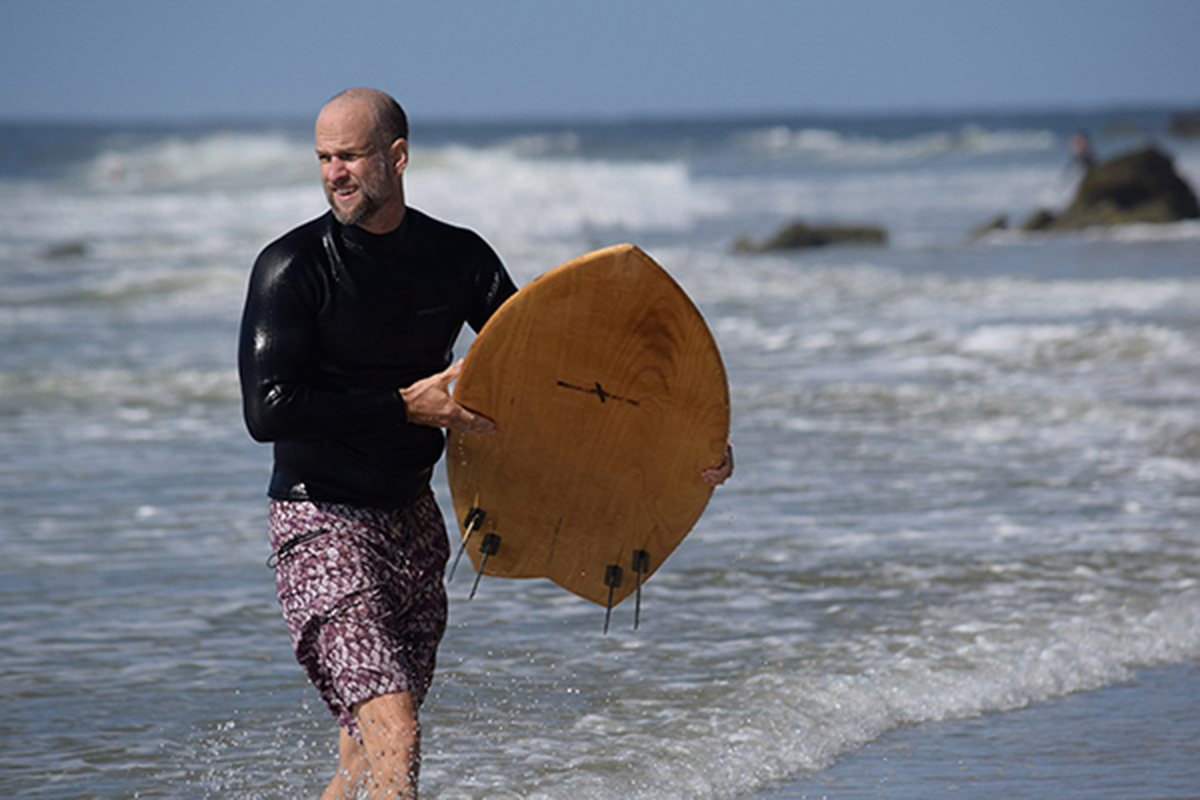 Recently, on the shore of Long Beach I spotted a surfer toting a surfboard from sea to sand for another run of the waves down the beach. There were about 30 to 40 surfers before me in the sea that glistening day. They had all manner of boards in a wide range of colors, aqua, vermillion, white and gold. But only one stood out. It was a wooden surfboard.