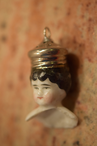 She has a unique pendant made from a remnant of a porcelain Frozen Charlotte doll. The piece was reborn into a pendant with the addition of a salt shaker crown atop it.