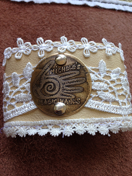 Among other things, Cheryl makes bracelets from sofa leather. Her etching of “Michelle’s Magic Hands” adorns it. She created this one for her hairdresser: