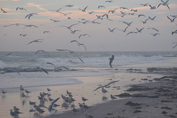 When I came off that boardwalk and saw that misty gull-filled scene with a lone fisherman far off, it was like a dream.