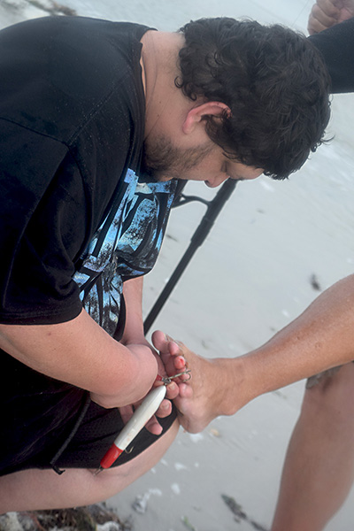 After only a few casts he suddenly sat in the surf, rod at his side, holding his foot. His loose rod threatened to be pulled into the sea. His wife next to me was concerned. I said, “It looks like he cut his foot on a shell or something.” Trini and Marcos put their own rods down and rushed to help.