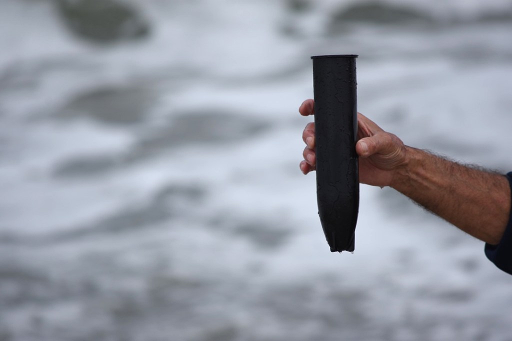 Joe’s artillery is a long, plastic tube loaded with a cylindrical round of frozen baitfish.