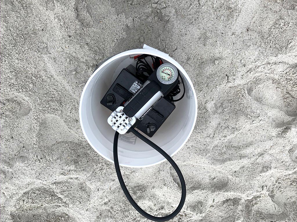 Joe totes a car battery for the air pump, along with his bait and cannon barrel in a sand cart.