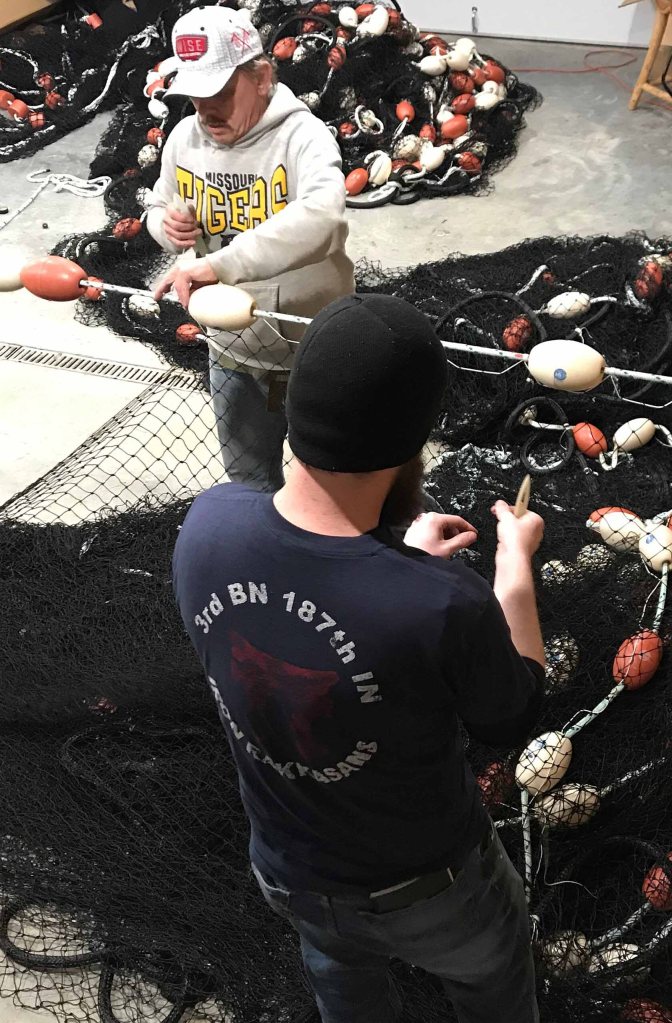 Greg said, ” “When you’re dealing with netting, your mind has to stay with tying those knots. And when you finished you see this big old net that you just built…You and your buddies just built this thousand-foot net, three, four football fields long. You made it; nobody’s shooting at ya. That’s a good thing.”