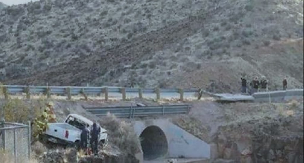 On Hwy 100 outside of Flagstaffs AZ, this pickup, traveling about 75 mph, broke through the guardrail, (where the people on the road are standing.) It flew right to left in the photo, then bounced off and across the culvert outlet and flipped end-over-end before landing upright on the left side of the culvert.