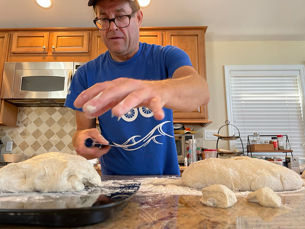 He then divides it into loaves. As Scott weighed each sourdough mound into six pieces, he said, “Im enjoying this. I like working with the dough. My whole life, I worked at a desk.” He did have surgery for carpal tunnel syndrome but much of that was from bicycling—and typing. An avid biker, he once bicycled across Iowa.