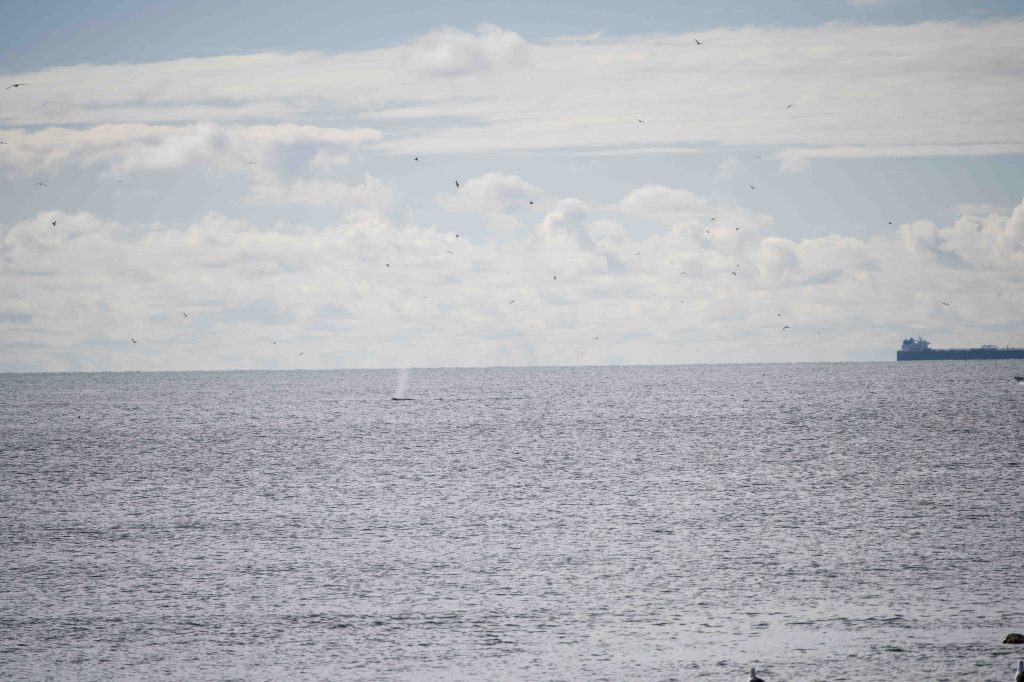 While talking to him, on the other side of the pass booth I saw two men pointing out to sea. I squinted out and I asked them, “Whales?” They answered, “Yes, see, right out there!”