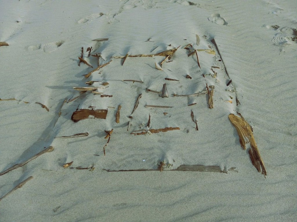 So, when friends Gregg and Alex, on the boards, pointed out a strange construction, I went down to our sea’s edge to see it. I found a driftwood pyramid about two and a half feet at its base and edge lines. Had art somehow risen from the sand?