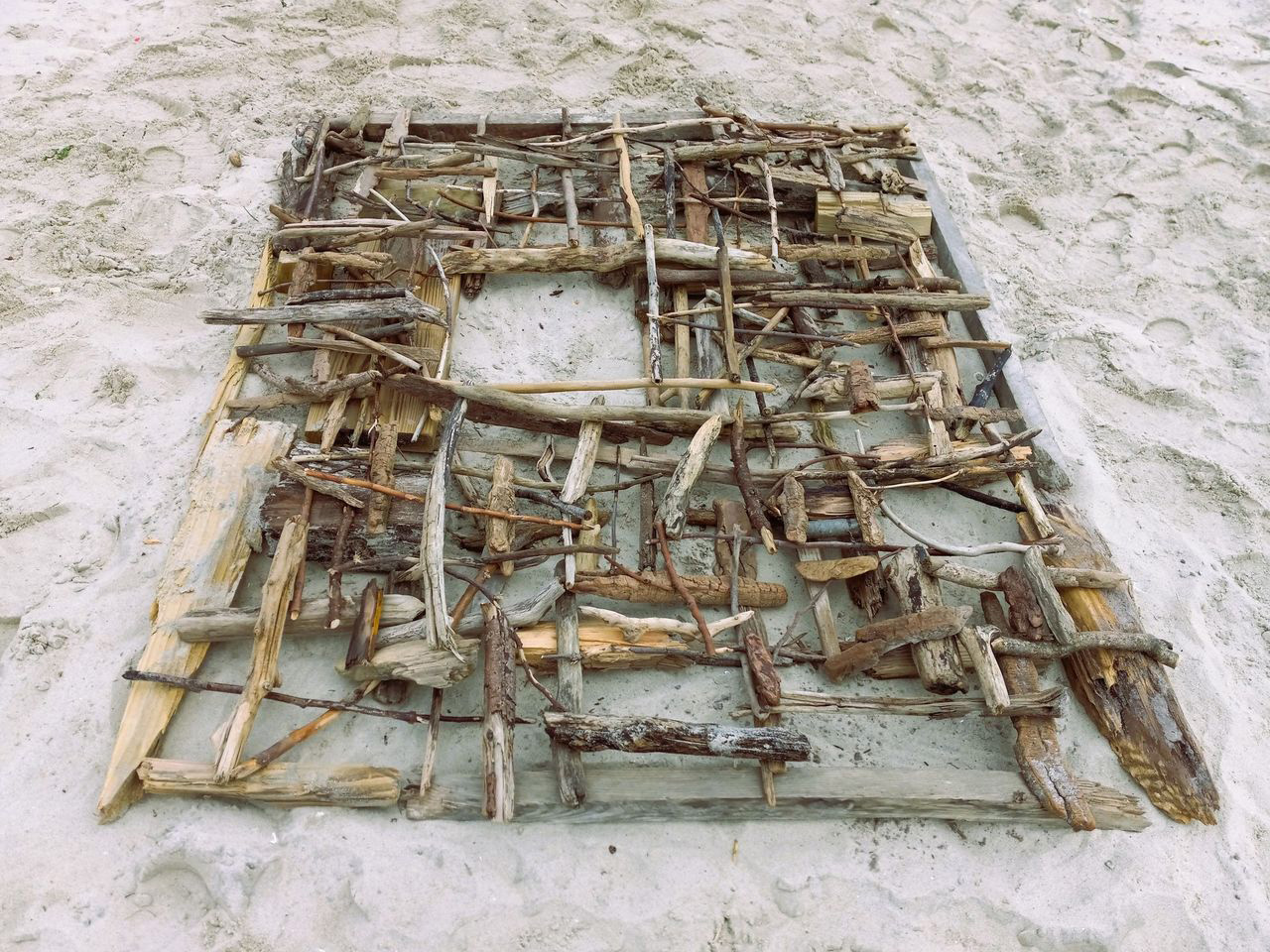 So, when friends Gregg and Alex, on the boards, pointed out a strange construction, I went down to our sea’s edge to see it. I found a driftwood pyramid about two and a half feet at its base and edge lines. Had art somehow risen from the sand?