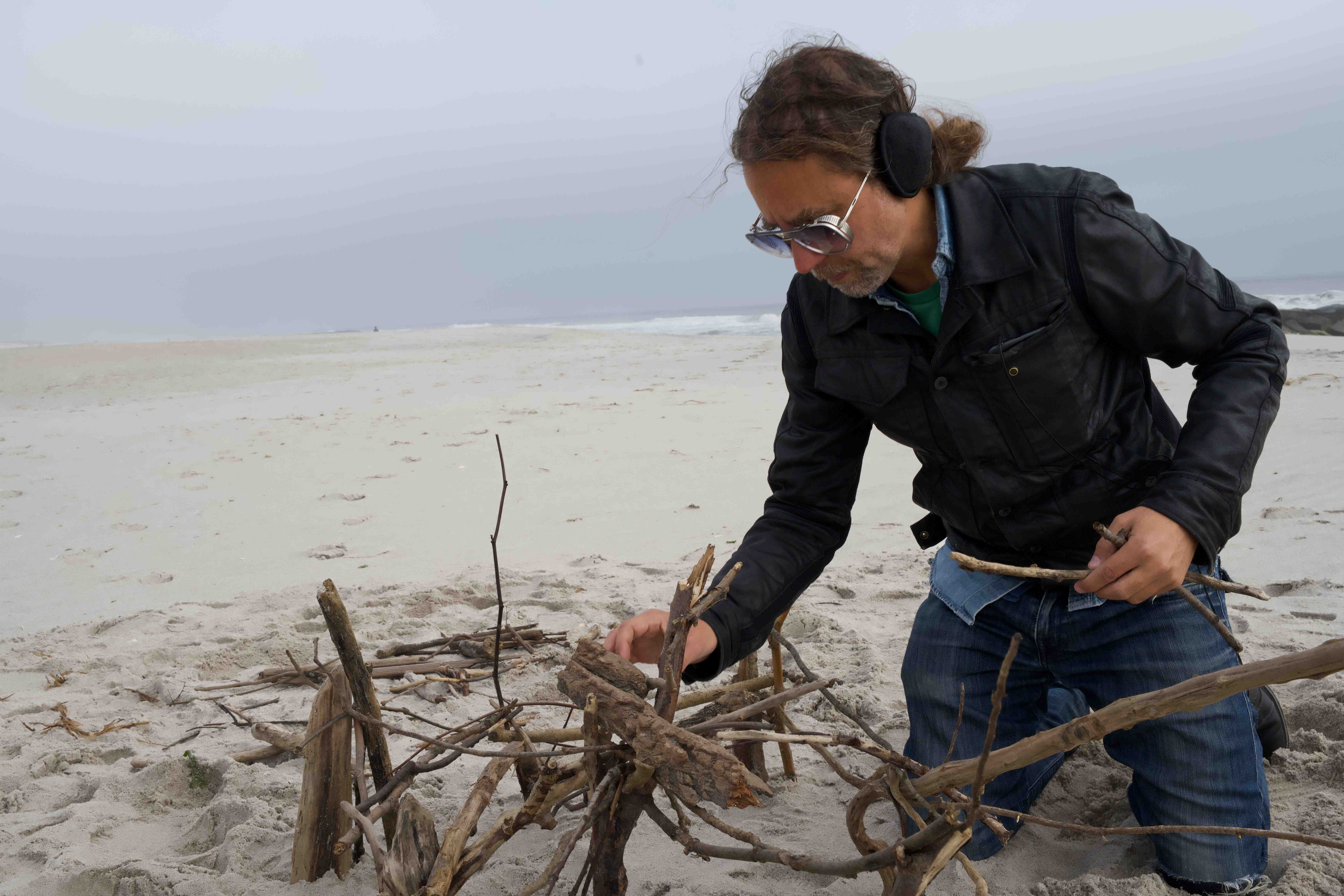 He said, “Building the sculptures is the exhalations, the breathing out of our connectedness.” He calls his beach sculptures “becomings” or as he later corrected, “Becoming-Line sculptures,” as he creates them, and unbecomings as they break down.