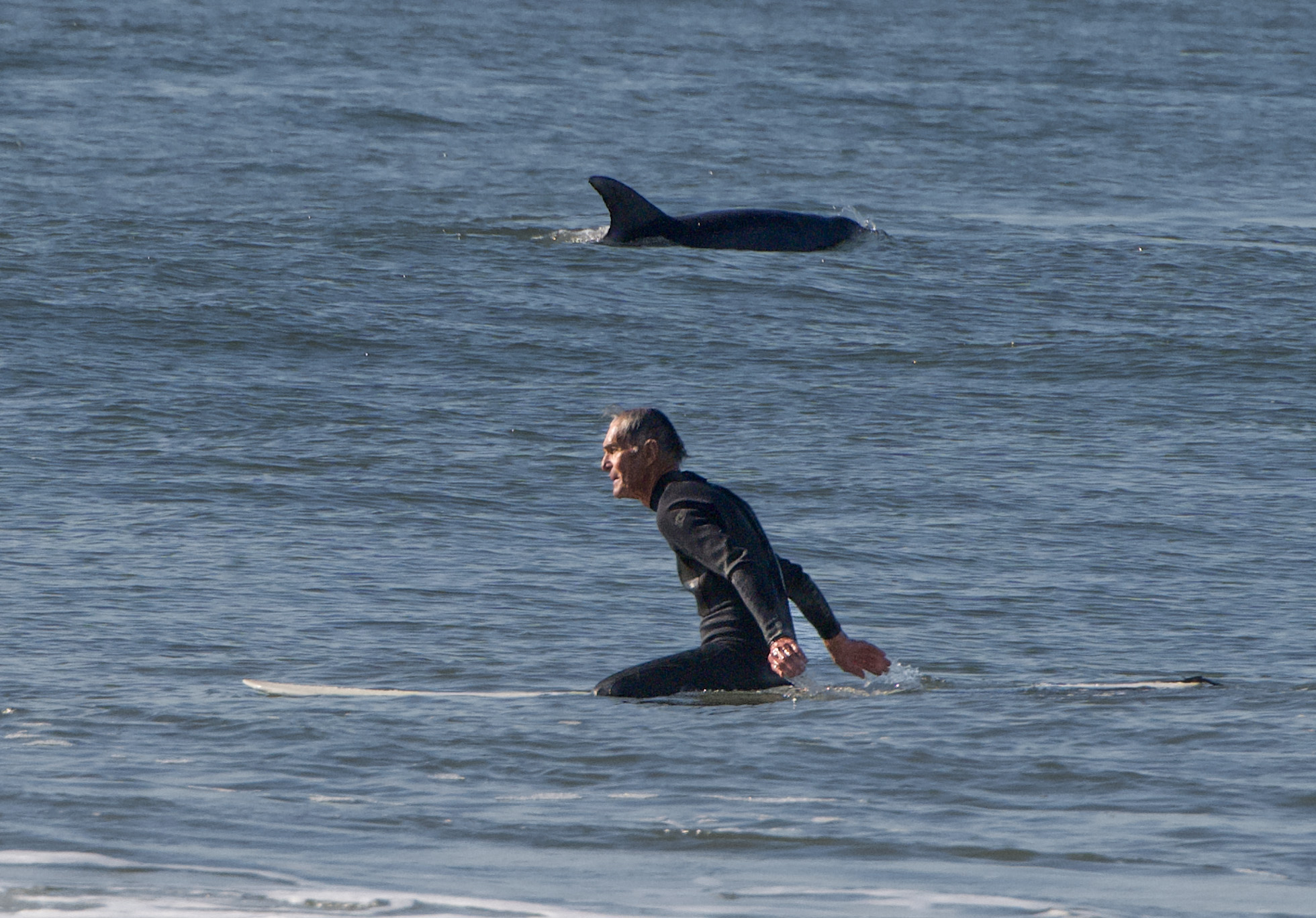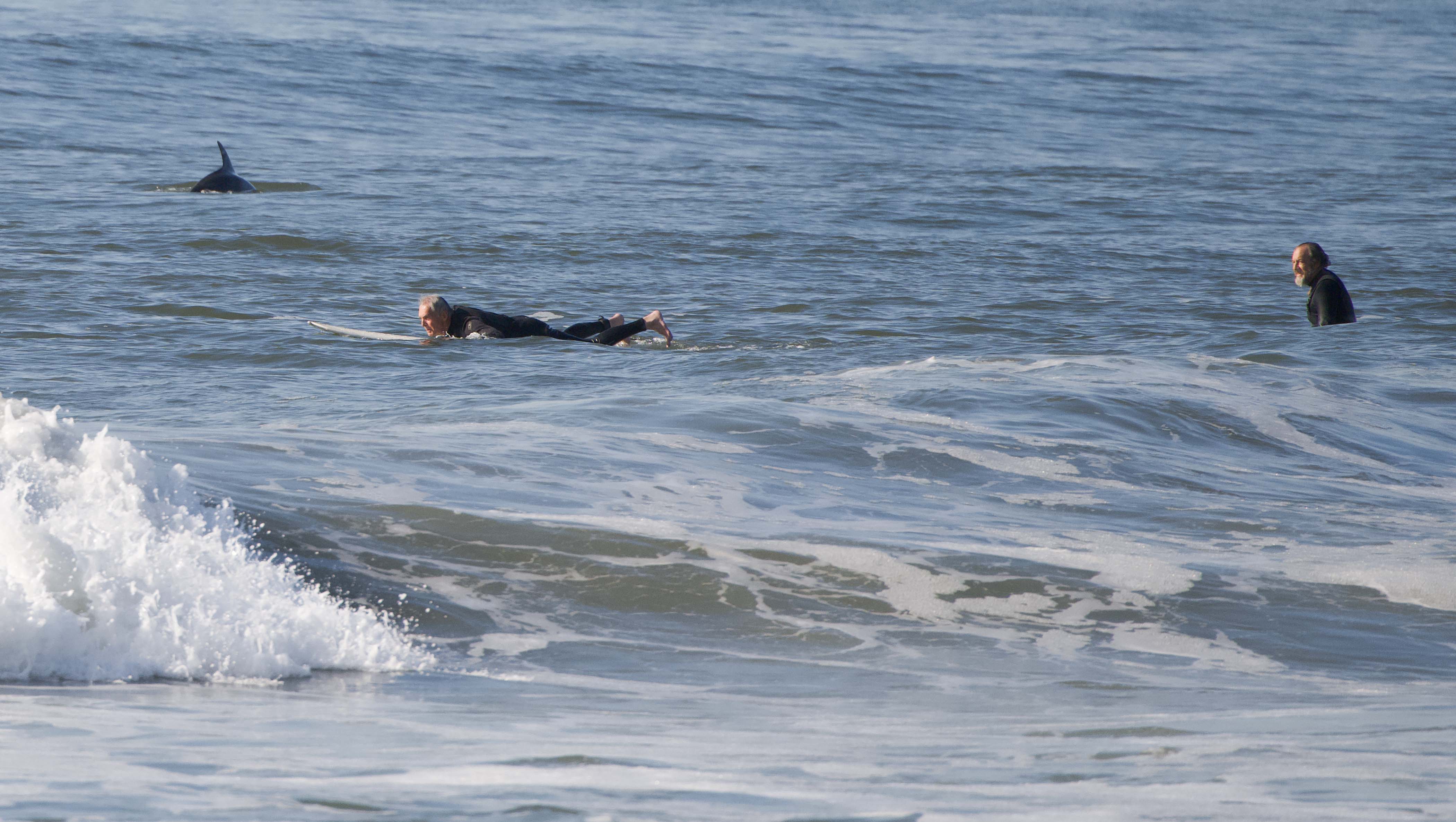 Soon, one dolphin joined another surfer: