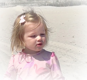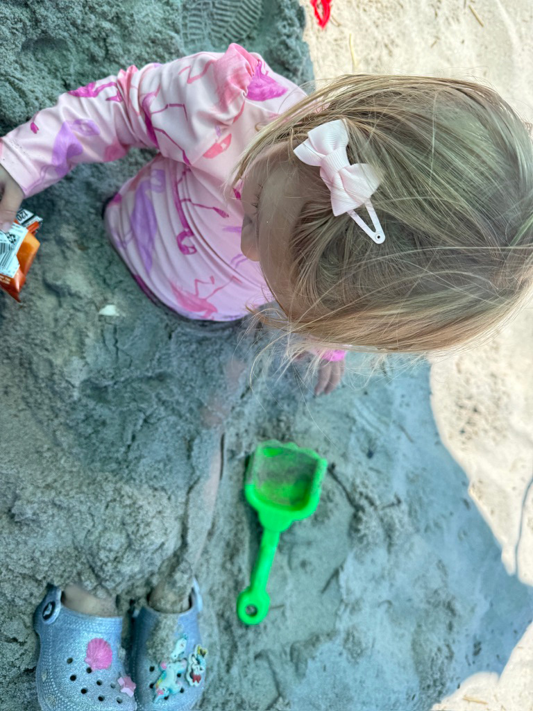 The family enjoys the July beach day with Olivia wearing her beautifully adorned Crocs.