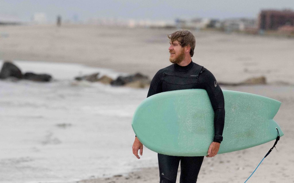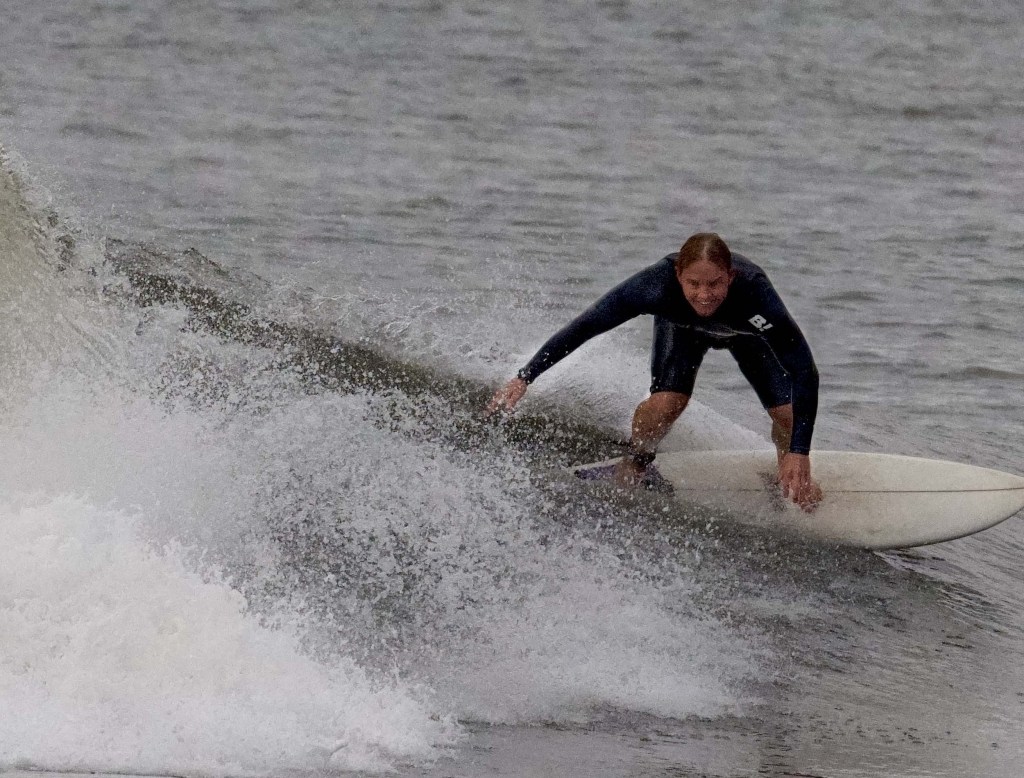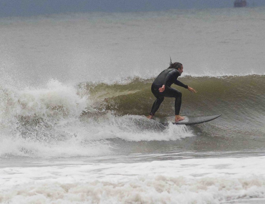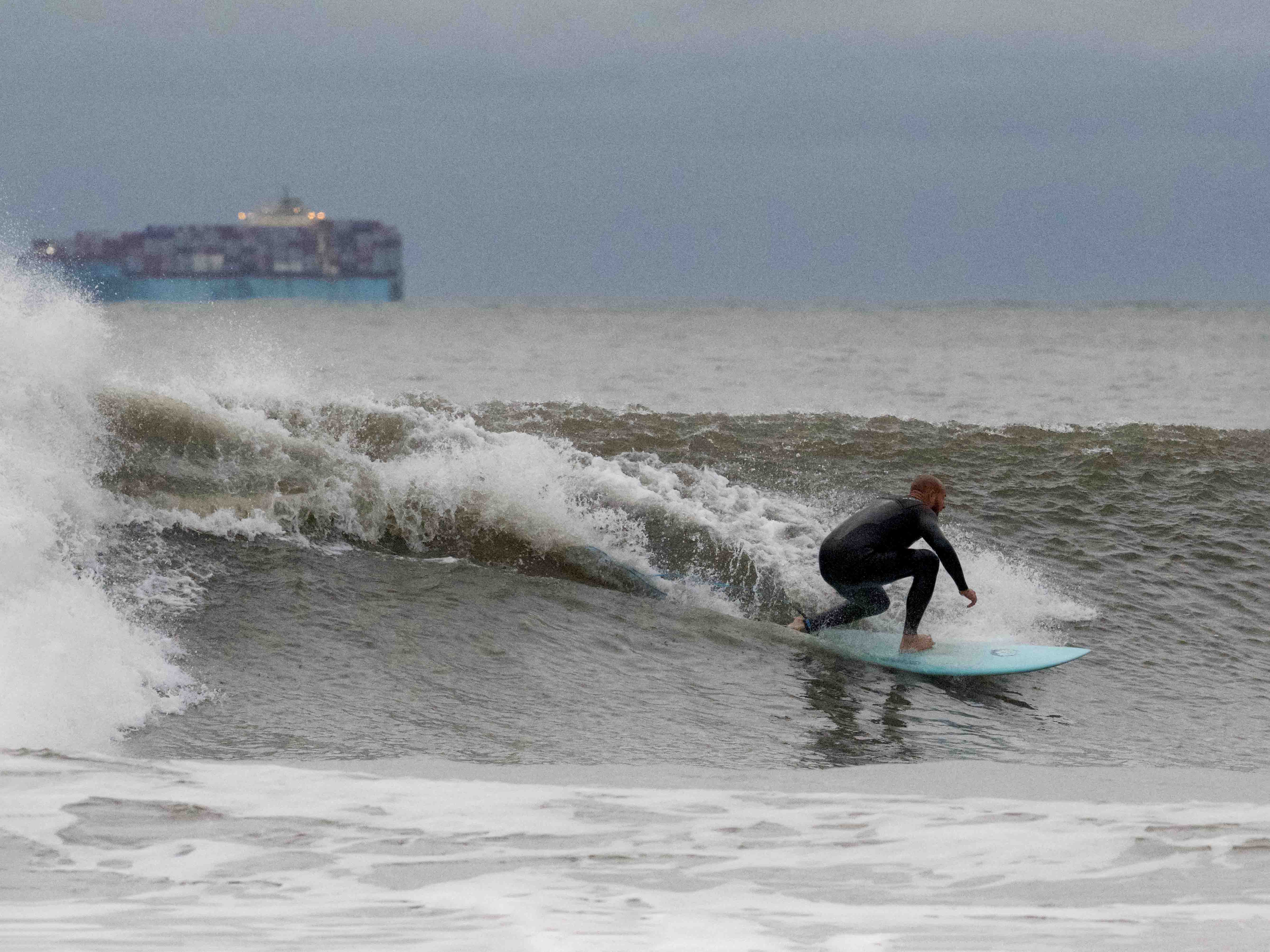 It’s not often that the surfer coordinates his board color with a ship. But it works, and you get extra points for that, your dudeness: