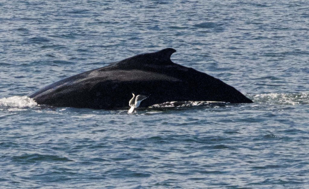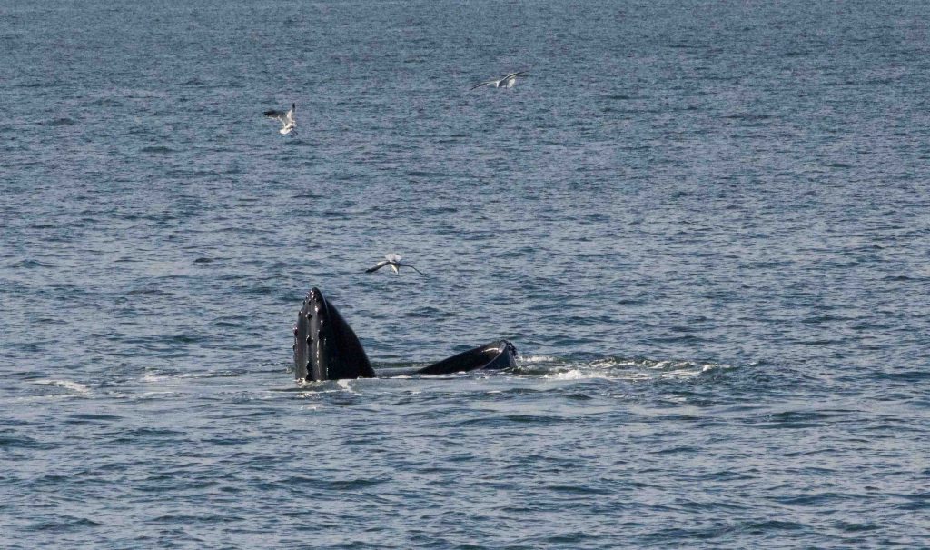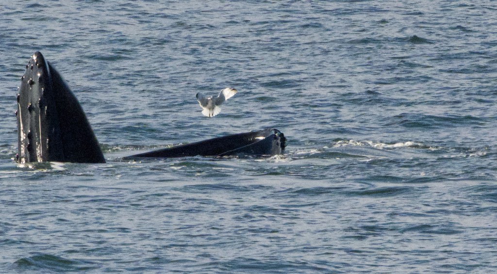 We only spotted one whale this day, but he accommodated us with some wide-jaw feeding, which the gulls got in on.