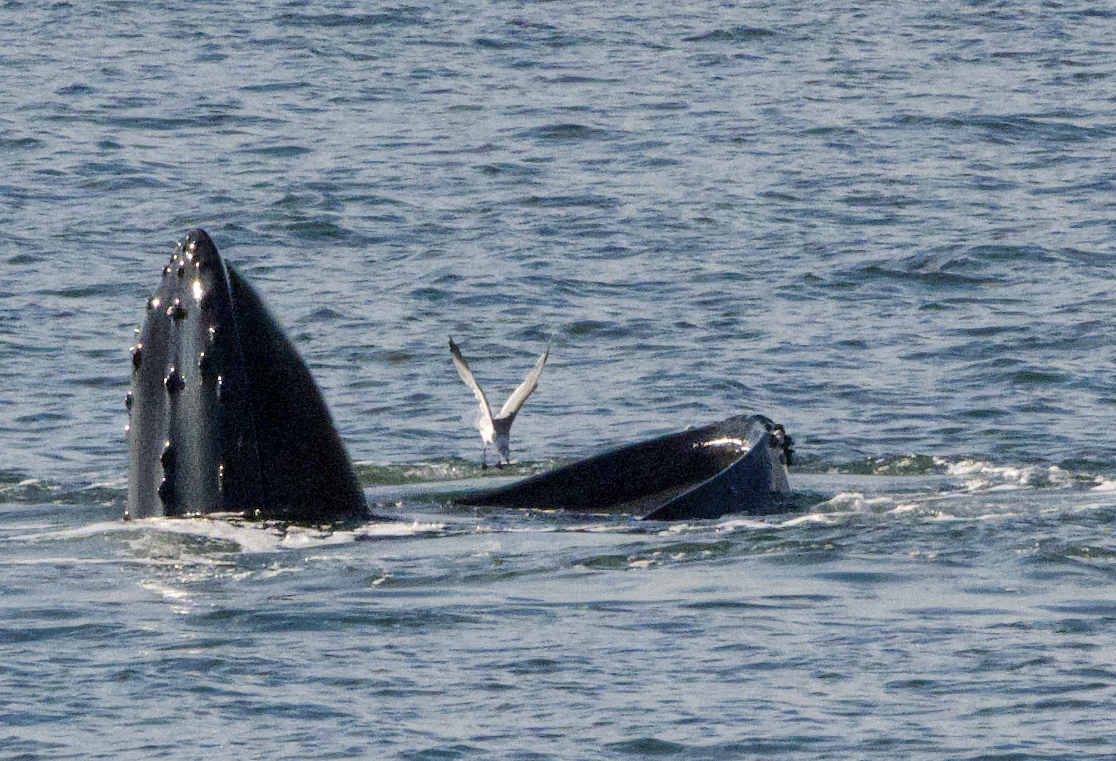 We only spotted one whale this day, but he accommodated us with some wide-jaw feeding, which the gulls got in on.